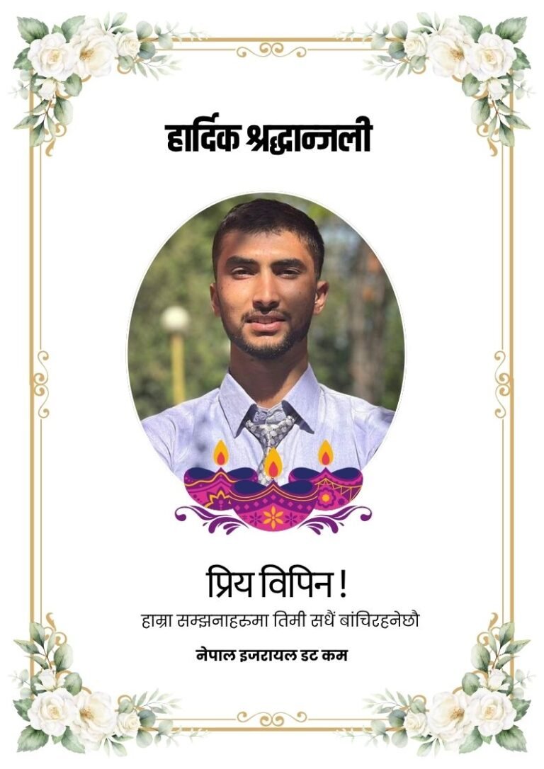 सुदूरपश्चिम विश्वविद्यालयबाट ‘लर्न एण्ड अर्न’ कार्यक्रम अन्तर्गत इजरायल पुगेका विपिन जोशी नेपालका कृषि विद्यार्थी हुन । उनलाई ७ अक्टोबरमा हमास आतंकवादीहरूले किबुज अलुमिमबाट अपहरण गरेका थिए। उक्त दिन हमासले अन्य १० नेपाली विद्यार्थीको हत्या गरिदिएका थिए । सो दिन हमासले लगभग १,२०० जनाको हत्या गर्नुका साथै कम्तिमा २५० जनालाई अपहरण गरेर लगेका थिए । अपहरणको २ बर्ष पछि नेपाली विद्यार्थी विपिन जोशीको निधन भएको पुष्टि भएको छ । हामी शोक सन्तप्त परिवार आफन्तजन तथा सम्पूर्णमा हार्दिक समवेदना प्रकट गर्दछौं ।