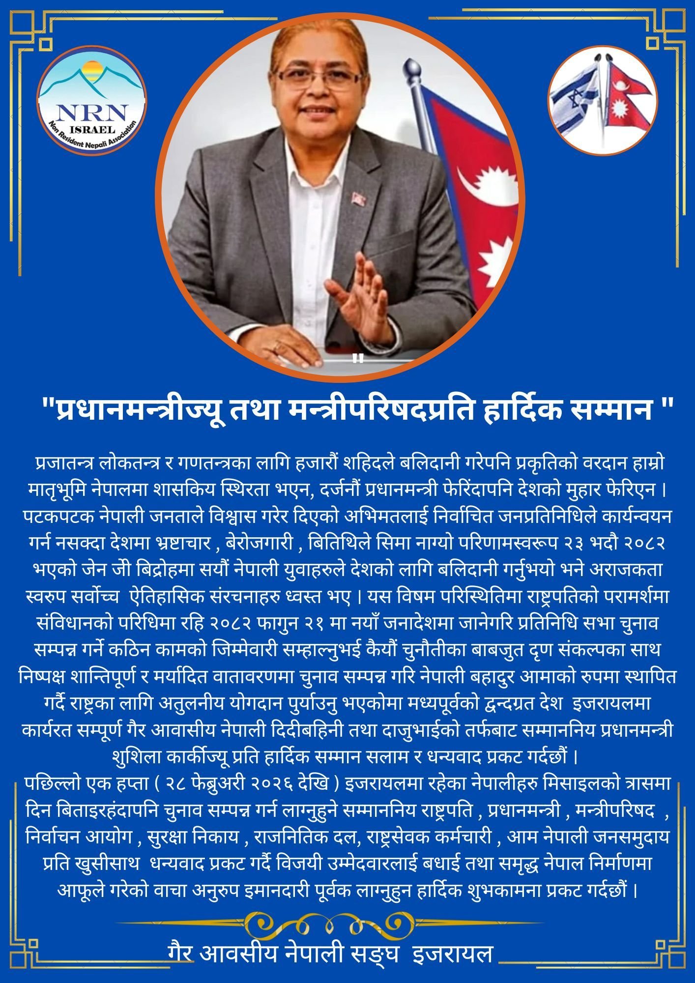 इजरायलमा कार्यरत गैरआवासीय नेपालीहरूको संस्था गैरआवासीय नेपाली संघ (एनआरएनए) इजरायलले प्रतिनिधि सभा निर्वाचन सफलतापूर्वक सम्पन्न गराएको भन्दै प्रधानमन्त्री शुशिला कार्कीप्रति सम्मान प्रकट गरेको छ। संस्थाले जारी गरेको प्रेस विज्ञप्तिमा नयाँ बन्ने सरकारलाई शुभकामना दिँदै देशमा स्थायित्व, सुशासन र आर्थिक समृद्धिको अपेक्षा पनि व्यक्त गरेको छ।