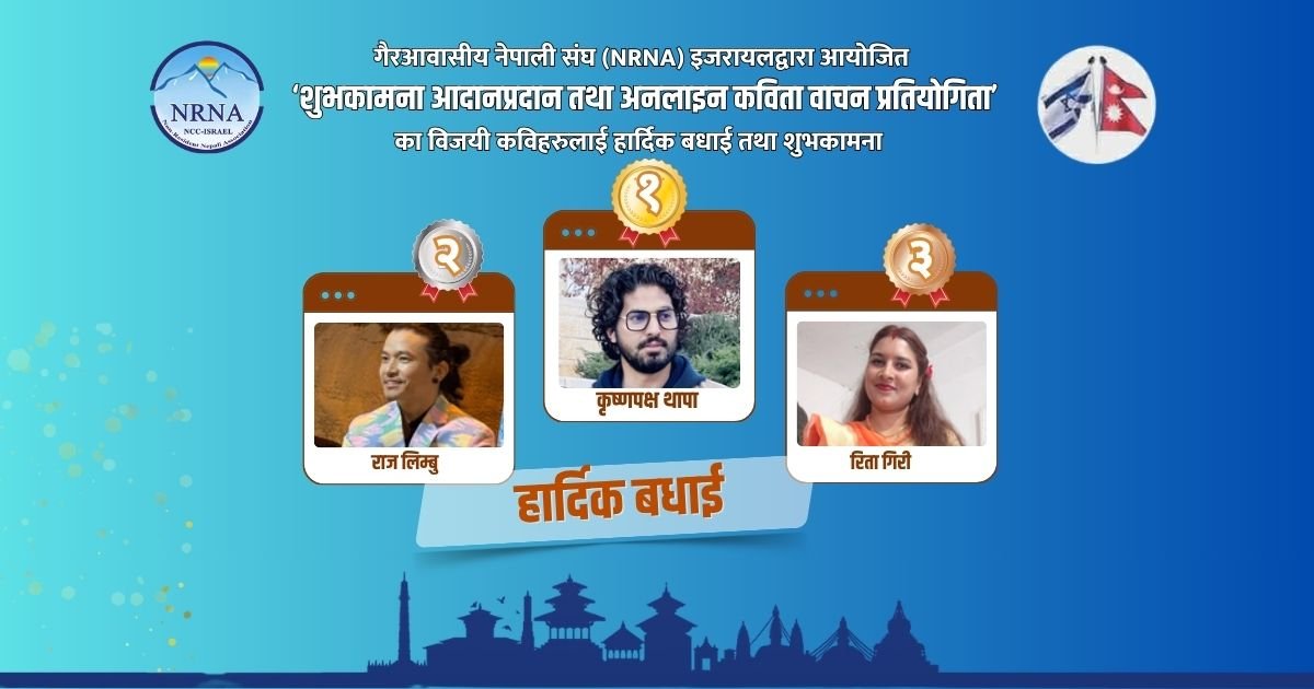 द्वन्द्वग्रस्त अवस्थाबीच पनि उत्साह र सकारात्मक सन्देश प्रवाह गर्दै इजरायलस्थित नेपाली समुदायले “नेपाली नयाँ वर्षको शुभकामना आदान–प्रदान तथा अनलाइन कविता प्रतियोगिता” विशेष रूपमा मनाएका छन्।